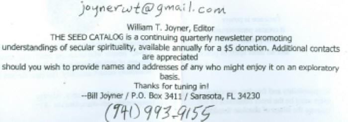 Bill Joyner P.O. Box 3411 Sarasota, FL 34230 This is the tough part, the pitch for continuing seed back support. But, as Van Morrison says in his song, "I'm real real gone," and "I can't stand up alone." Just kindly let me know by checking the form below, whether and/or how you'd like to respond to the ongoing 3 times a year publication of THE SEED CATALOG: ___ Yes, bring it on, in whatever form! ___ No more mailings, will check it out on the web at www.seedcatalog.cc (or not) -- ha, ha! Thanks, too, for any financial or moral support. ($5 donation suggested) Bill Joyner joynerwt@gmail.com