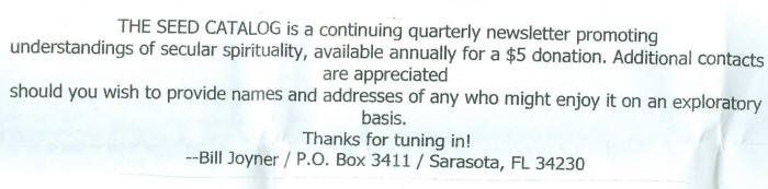 Bill Joyner P.O. Box 3411 Sarasota, FL 34230 This is the tough part, the pitch for continuing seed back support. But, as Van Morrison says in his song, "I'm real real gone," and "I can't stand up alone." Just kindly let me know by checking the form below, whether and/or how you'd like to respond to the ongoing 3 times a year publication of THE SEED CATALOG: ___ Yes, bring it on, in whatever form! ___ No more mailings, will check it out on the web at www.seedcatalog.cc (or not) -- ha, ha! Thanks, too, for any financial or moral support. ($5 donation suggested) Bill Joyner joynerwt@gmail.com